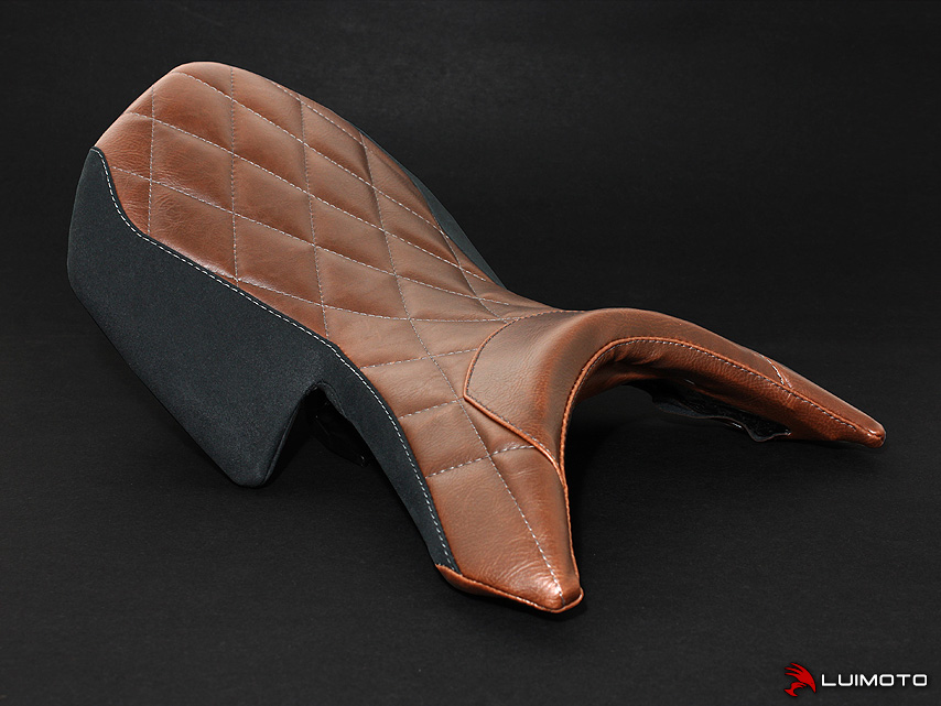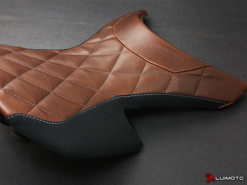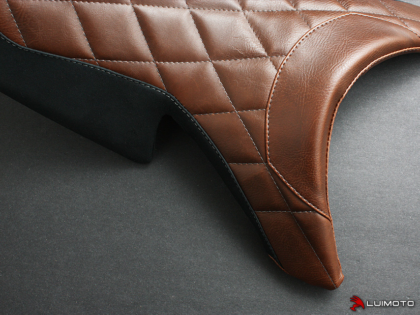 Introducing our Luimoto seat cover design for your Benelli Tornado. It uses our vintage leather look fabric stitched into a classy diamond pattern. Black suede sides with silver stitching finishes the look of your Italian beauty. Stand out with the finishing touch of Luimoto.