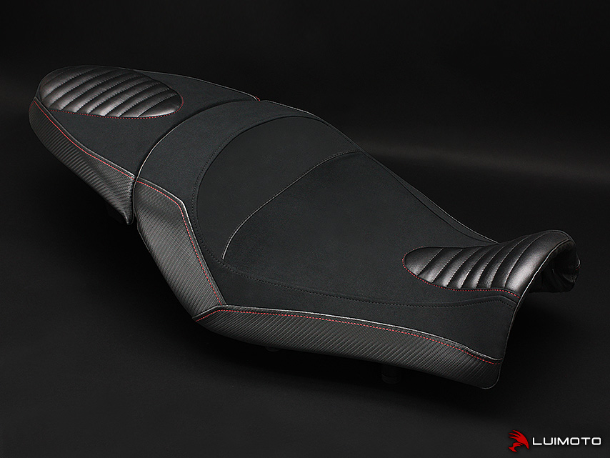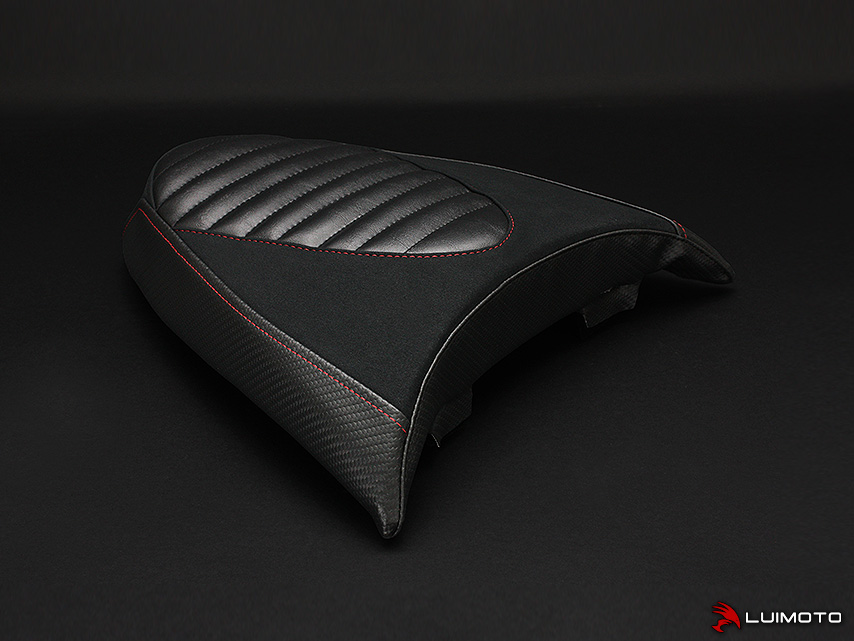 Introducing the MGX-21 seat cover for your Moto Guzzi! A unique marine grade vinyl pad is stitched with a classic style pattern. It is complimented with our luxurious suede riding surface. Red stitching defines the bold textures of the carbon fiber look material. All of these elements come together to accentuate the fine details of your Italian machine. Stand out with the finishing touch of Luimoto!